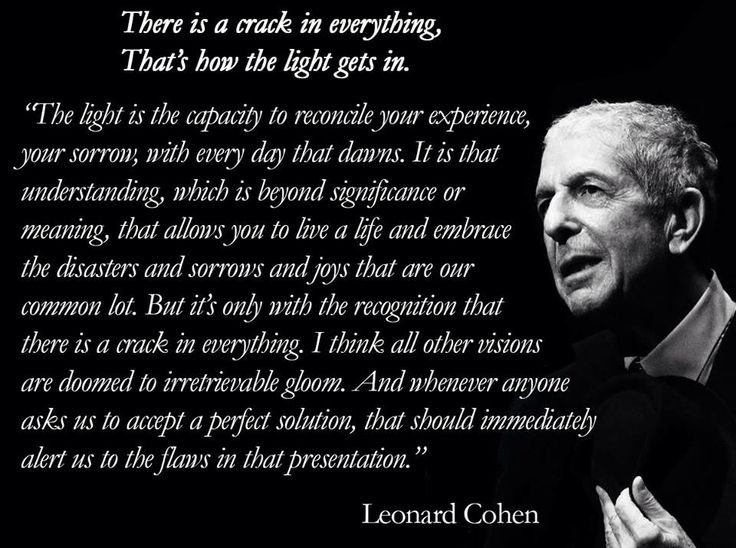 “Forget your perfect offering. There is a crack in everything. That’s how the light gets in.” (Leonard Cohen/Hemingway) This phrase implies that if we are broken then there is that same point of hope. As with Hemingway clearly it could break you open to the light of a higher life or kill you, if you dont break. The crack is when we experience vulnerability- not talking about it like this. When you feel pain, vulnerbility or suffering there is the potential for humility and the question, what is it all about.? Now we are open to the potential of deeper ground & an openness to the truth of existence.